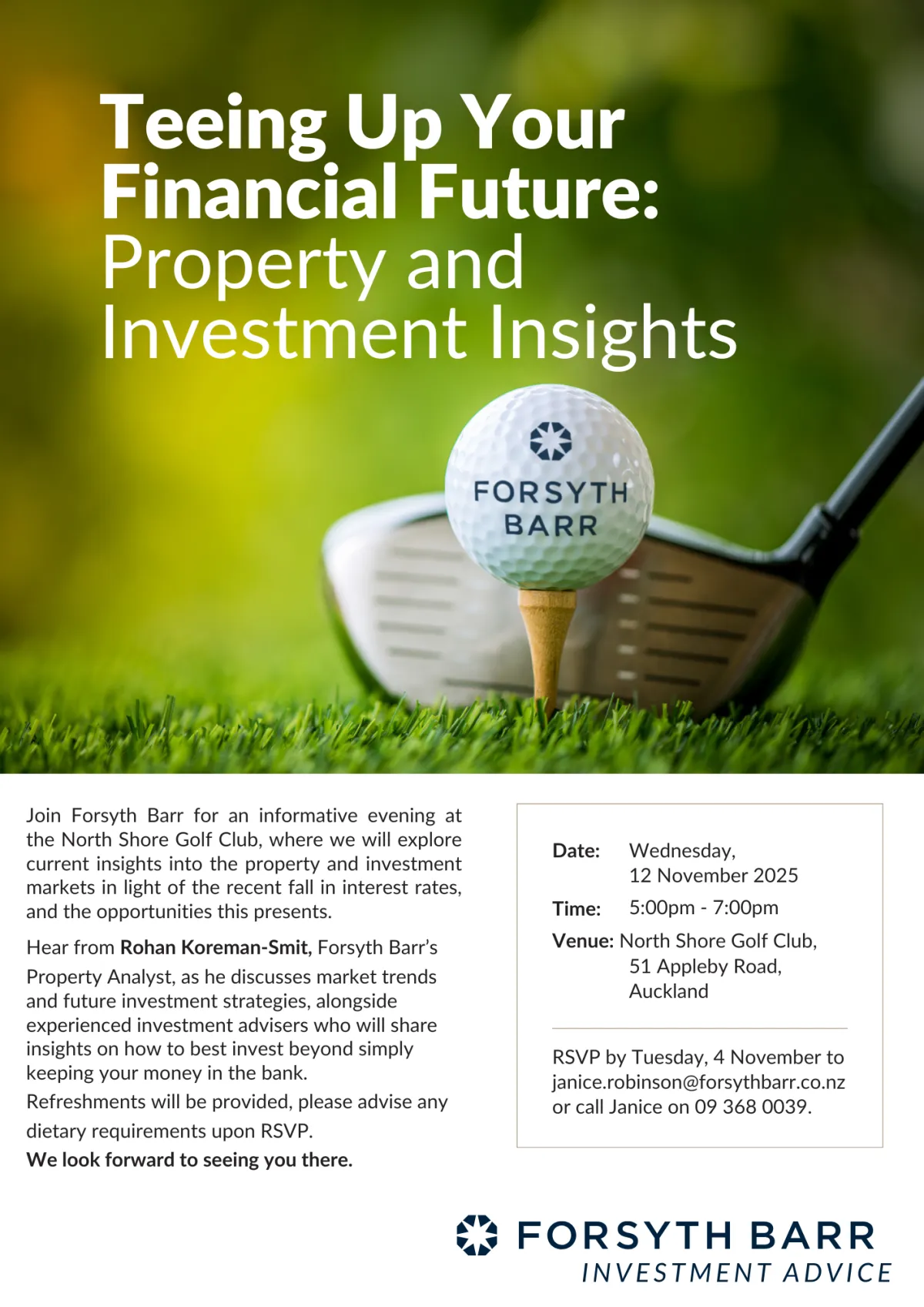 Just a friendly reminder to RSVP for the Forsyth Barr event being held here at North Shore Golf Club on Wednesday, 12 November, 5–7pm.