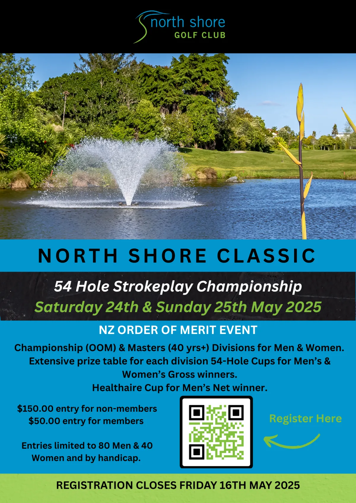 Sat 24th & Sun 25th May: North Shore Classic, 54 Hole Open Strokeplay Championships for Men & Women. Please see flyer for more information.